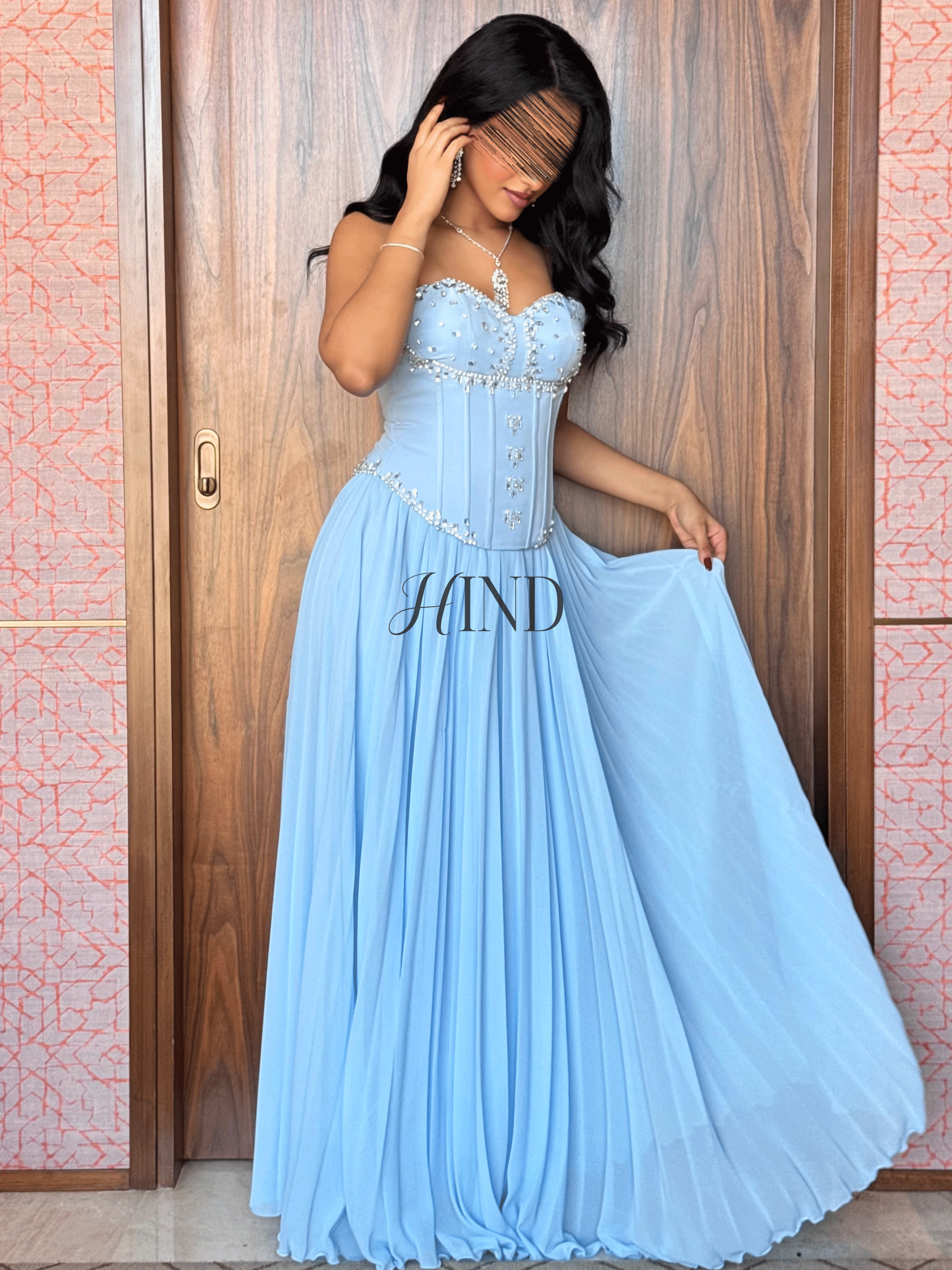 فستان سماوي أنيق بتصميم كورسيه مرصّع بالكريستالات اللامعة يبرز جمال الخصر ويضفي لمسة فاخرة، مع تنورة منسدلة بانسيابية حالمة تعكس أنوثة ناعمة وإطلالة ملكية متكاملة. ✨💙