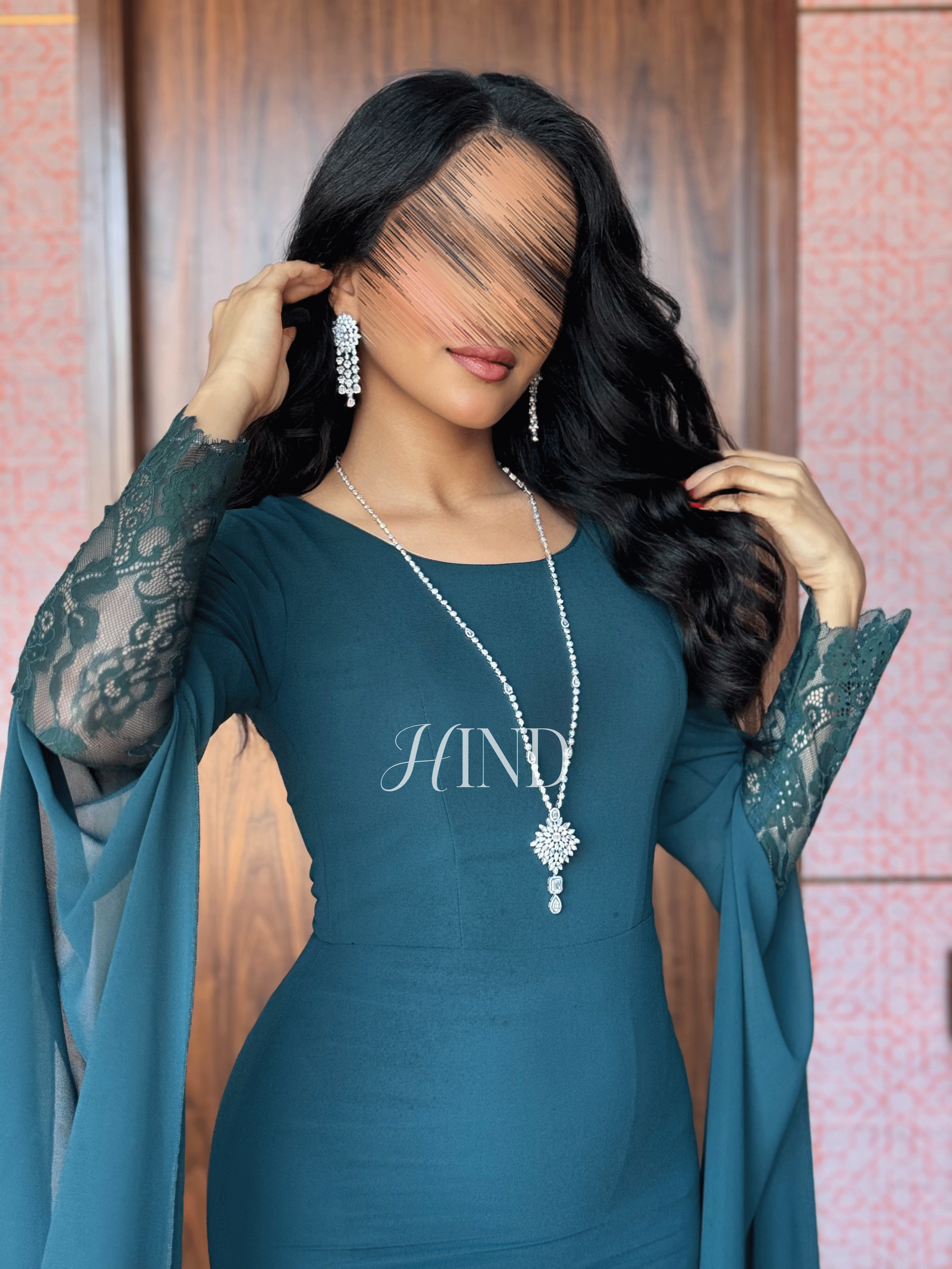فستان سهرة أنيق بتصميم انسيابي يبرز جمال القوام بإطلالة راقية بتفاصيل أكمام طويلة منسدلة تضيف لمسة فخامة وأنوثة لافتة.