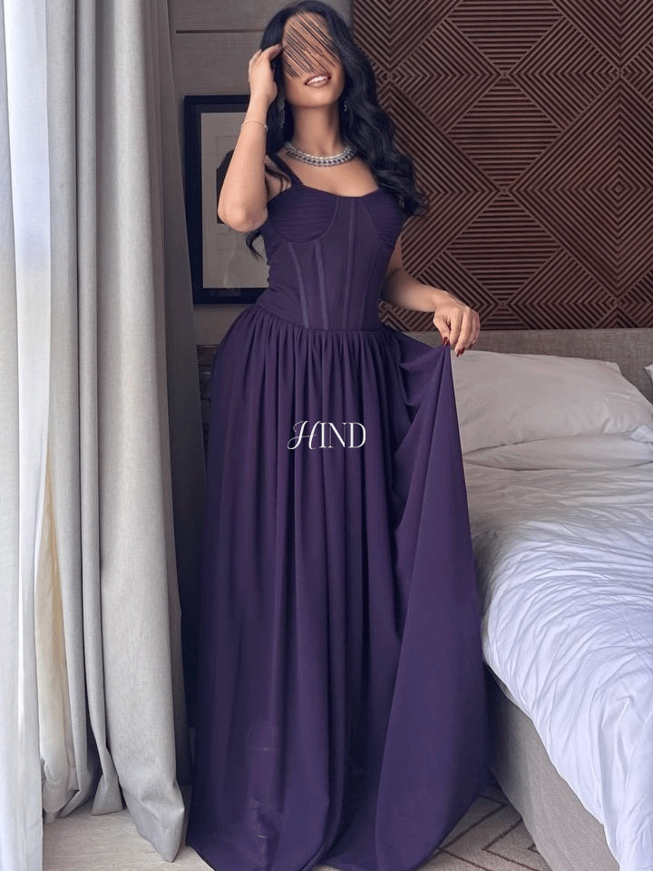 فستان بنفسجي أنيق بتصميم كورسيه يبرز الخصر ويمنح إطلالة فاخرة تنسدل بانسيابية تضيف لمسة رقي وجاذبية ناعمة.