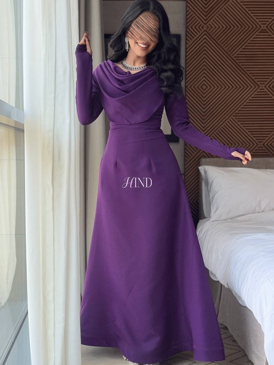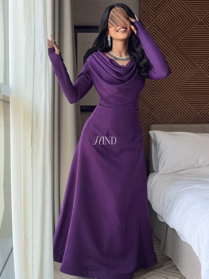 فستان بنفسجي أنيق بتصميم انسيابي يبرز جمال القوام، يتميّز بياقة متدلية تضيف لمسة فخمة وأنثوية.